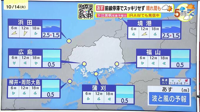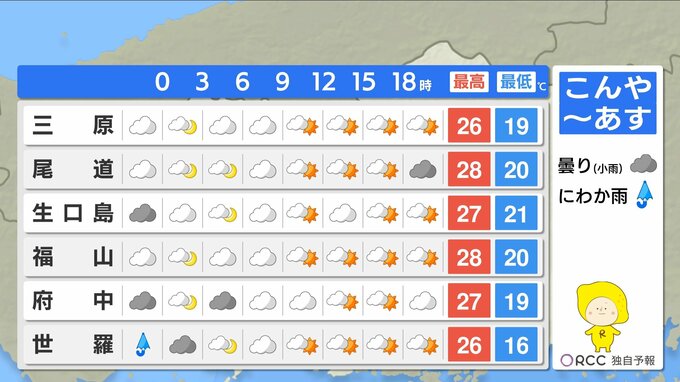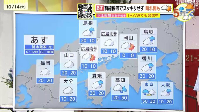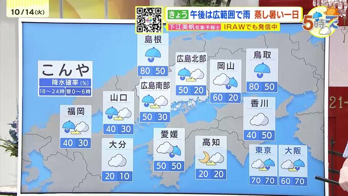 きょう14日(火)の広島県内は、午前中は晴れ間がありましたが、午後は広い範囲で雨が降りました。最高気温は、福山で29.9℃ 府中市で29.8℃まで上がるなど、きのうほどではありませんでしたが厳しい残暑が続いています。