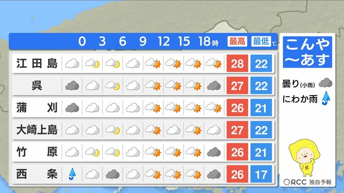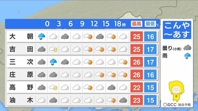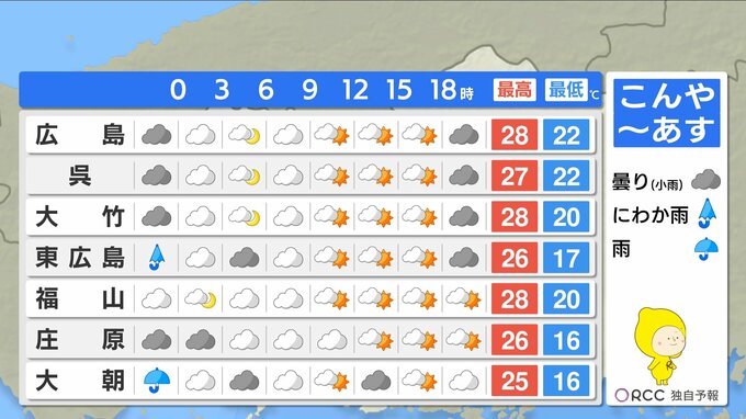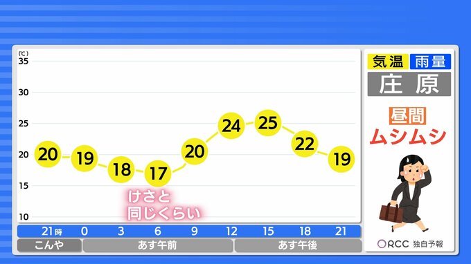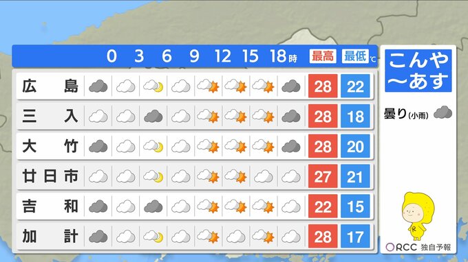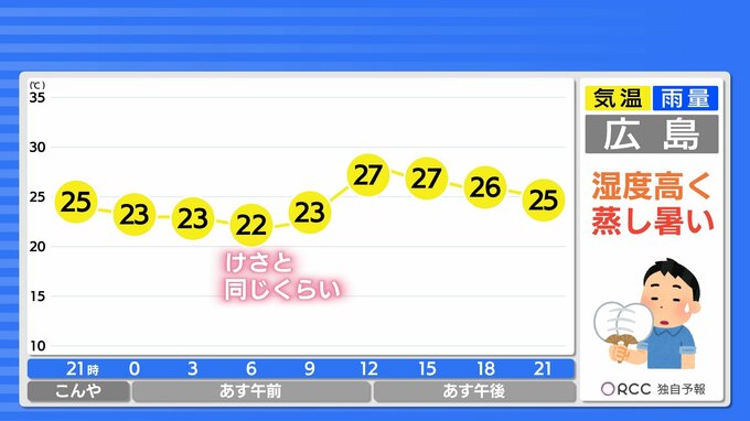 最低気温は、けさと同じくらいで平年より高い傾向が続きます。最高気温は、沿岸部で27℃~28℃くらいの地点が多く、あすは日差しが届いて湿度が高めなので、蒸し暑い一日になりそうです。昼間は半袖日和になるでしょう。
