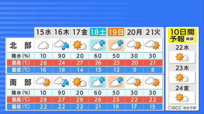 あさっては前線の影響で再び雨が降るでしょう。金曜日は晴れる予想ですが、週末は前線や低気圧の影響で雨が降りやすくなる見込みです。気温は週末まで平年より高い傾向で残暑が続きますが、週末の雨が季節を進める雨になりそうです。来週月曜日以降は気温が下がり、この時期らしい気温になるでしょう。