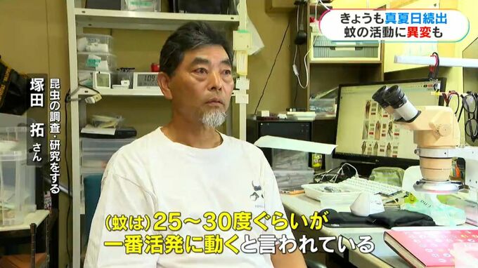 (昆虫の調査・研究を行なう塚田拓さん)「(蚊は)25~30度ぐらいが一番活発に動くと言われている。今年の夏は蚊が少ないという人が多かったと思うが、まだ生きている。その適温になる時期を狙ってじっと待っている」