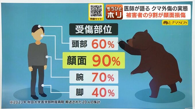 クマの攻撃で傷を負った部位のうち、顔面が90%、続いて腕70%、頭部60%、脚40%と上半身が圧倒的に多くなっています。