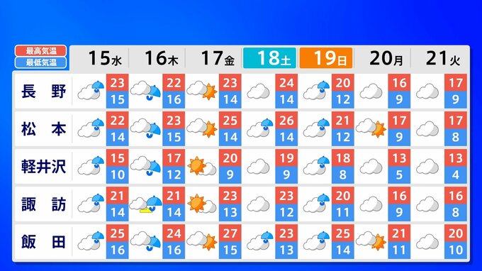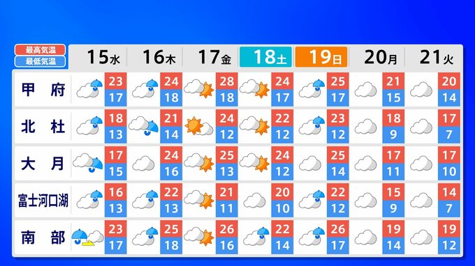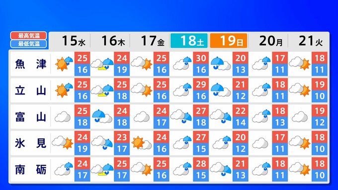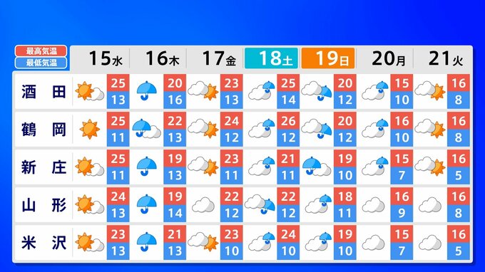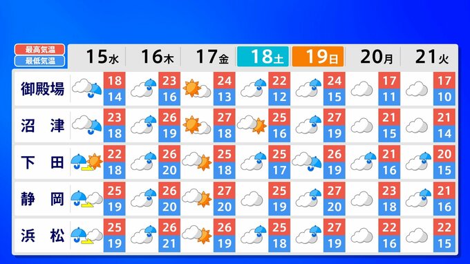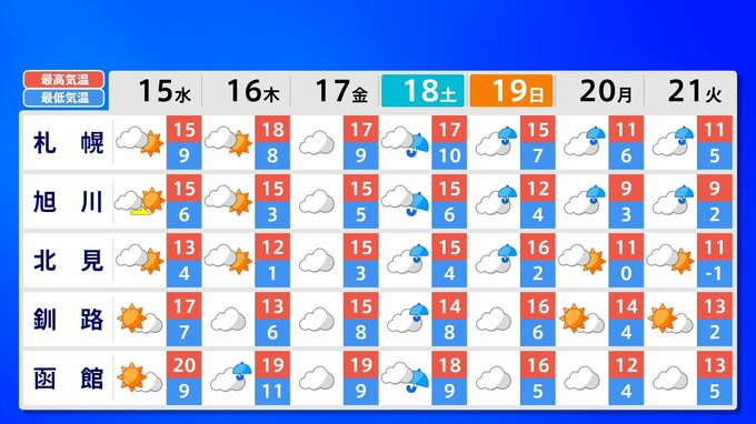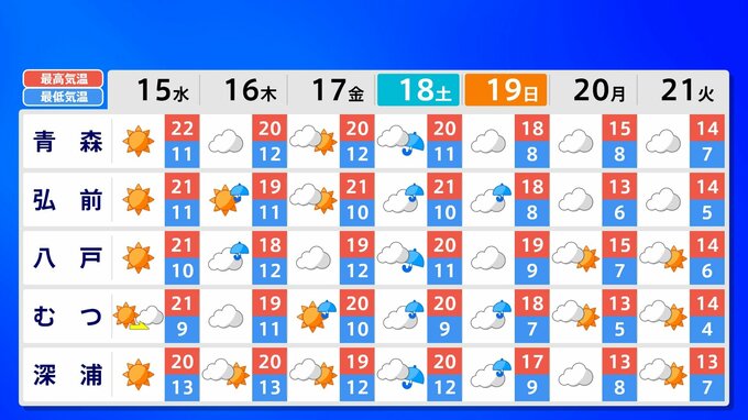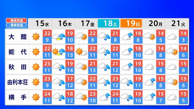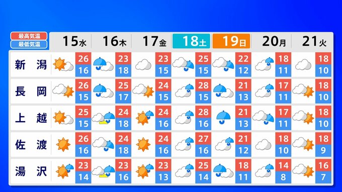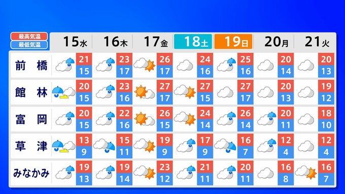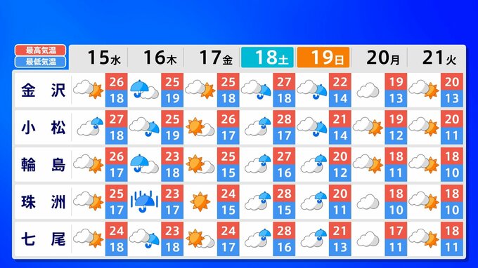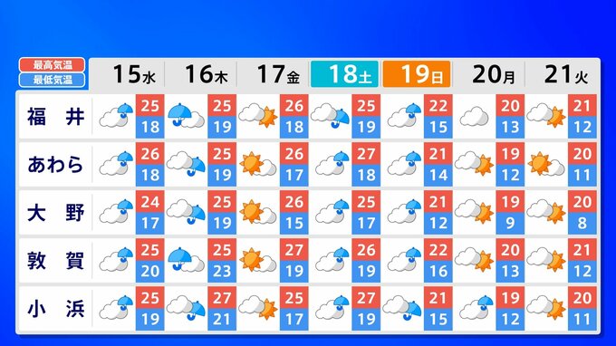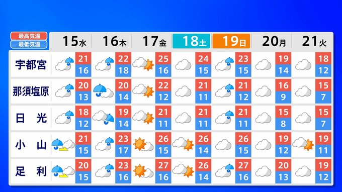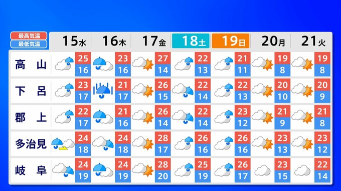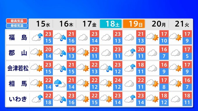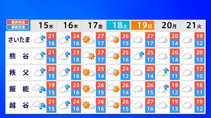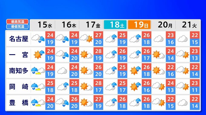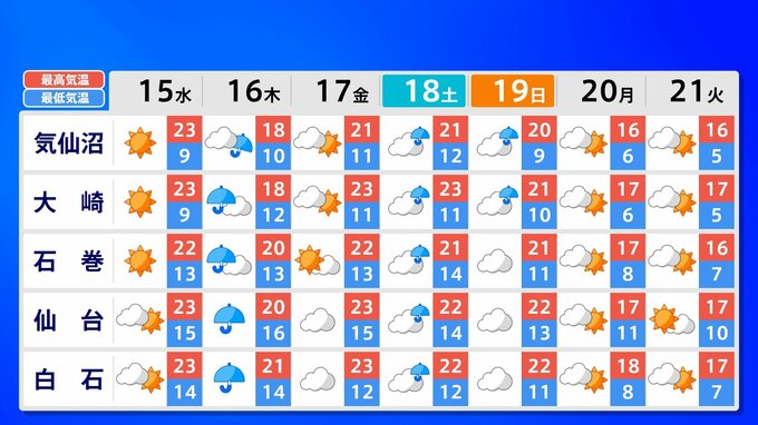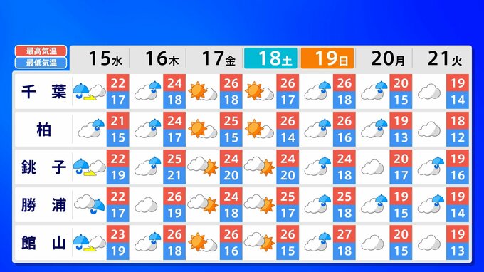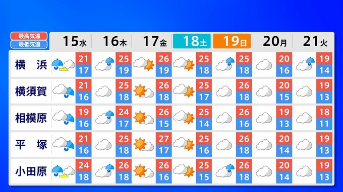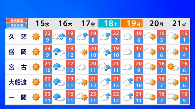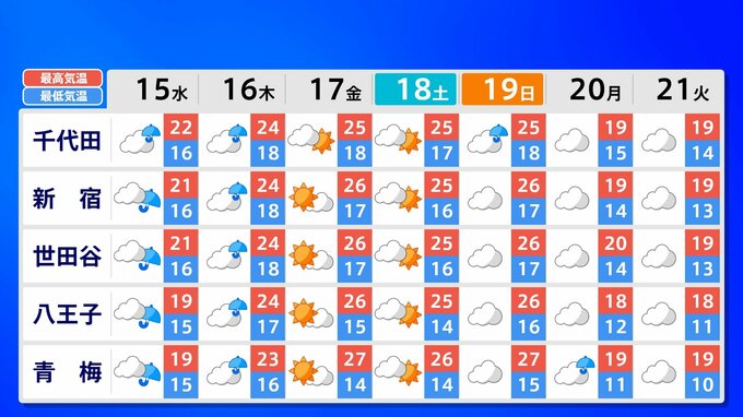 また前線通過後は、北から涼しい空気が入り気温が下がる見込みです。20日(月)21日(火)の予想最高気温は〈東京19℃(11月上旬並み)〉〈大阪22℃(10月下旬並み)〉となっています。