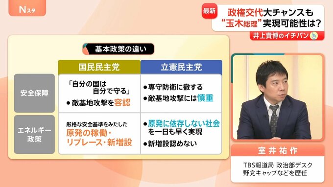 国民民主党の玉木代表は基本政策の一致を見ないと、今後仮に政権交代になったとしても長くは続かないとのことで、特に「安全保障」と「エネルギー政策」の2つを重視しているということです。
