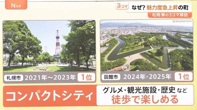 函館市はグルメ・観光施設・歴史などが徒歩で楽しめる「コンパクトシティ」だという点が逆転につながったのではないかとみられています。