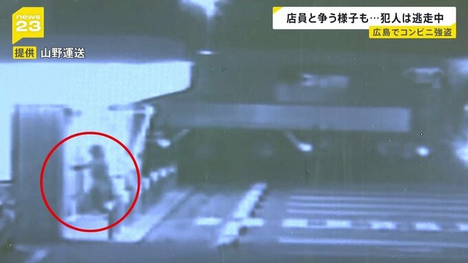 14日未明、広島県福山市のコンビニエンスストアで、男が店員に刃物を突きつける強盗未遂事件が起きました。これは現場近くの防犯カメラの映像。店の前で犯人とみられる男がコンビニの店員と向き合い、争うような様…