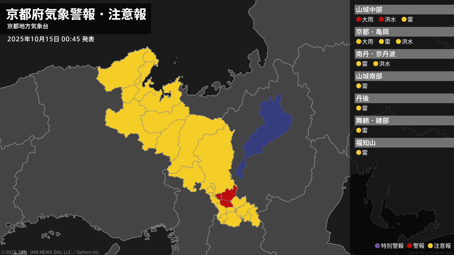気象台は、午前0時45分に、洪水警報を宇治市に発表しました。また大雨警報(浸水害)を城陽市に発表しました。