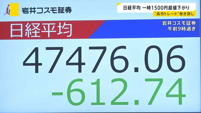 先週まで進んでいた円安・株高のいわゆる“高市トレード”が巻き戻される形となり、日経平均株価終値は1241円安い4万6847円で取引を終えました。