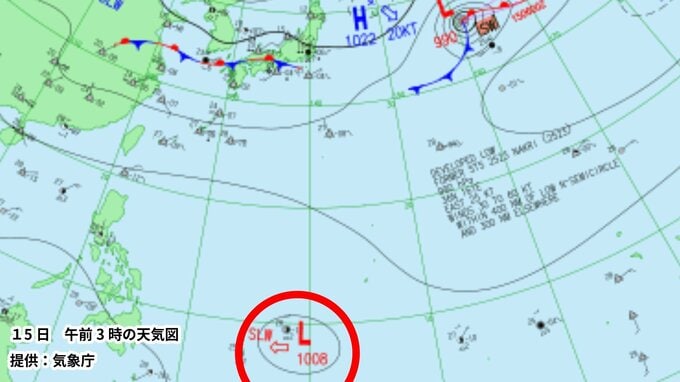 予想される熱帯低気圧は15日午前3時現在はカロリン諸島にある低圧部(1008ヘクトパスカル)【画像③】ですが、午後9時の予想天気図によると、その後フィリピンの東の海域に北上していて【画像④】、16日(あす)午後9時には熱帯低気圧に発達する見込みだということです。
