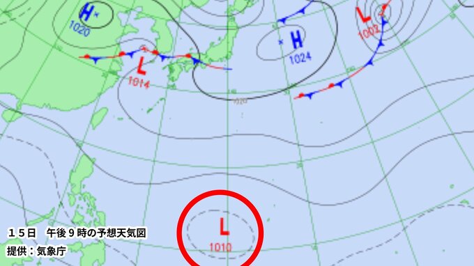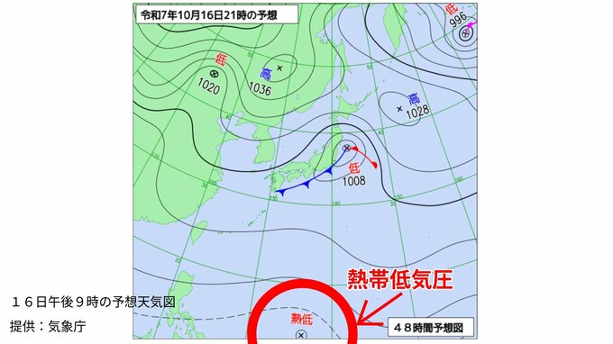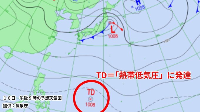 気象庁が発表する16日(あす)午後9時の予想天気図によりますと、フィリピンの東に『台風のたまご』となる『熱帯低気圧』が発生するということです。