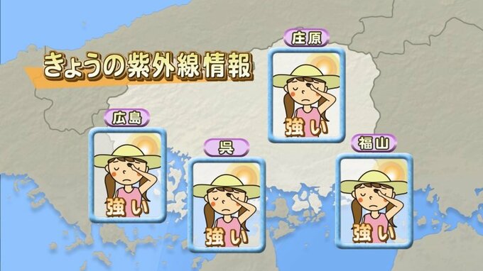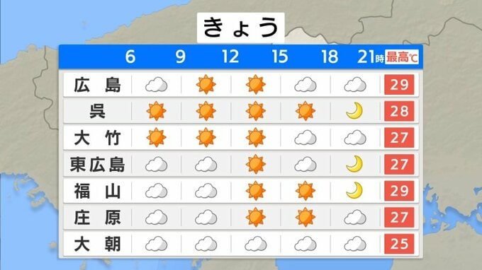 きょうは、前線が近く湿った空気が入りやすいため、雲が多い天気でしょう。雨が降っても長くは続かず、雲のすき間から日差しも届く見込みです。最高気温は、広島・福山で29℃、呉で28℃、庄原で27℃の予想です。湿度が高く蒸し暑い見込みです。夜遅くに雨が降るところがあるでしょう。残暑が厳しいのでご注意ください。