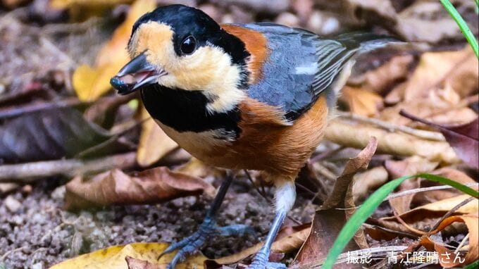 落ち葉の上で木の実をくわえる小鳥。時々、見かけるこの鳥、とても賢いんだそうです。【画像①】