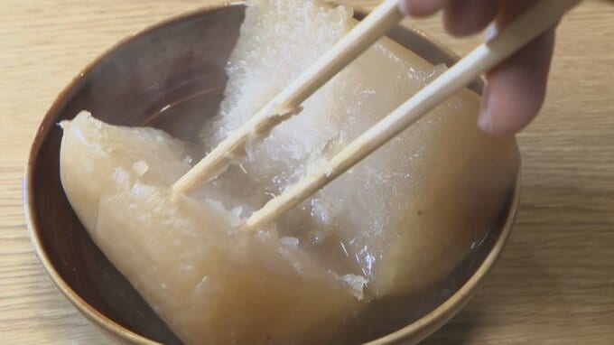 およそ10センチと大きくカットし、丸1日煮込んで味をしっかり染み込ませたダイコン。