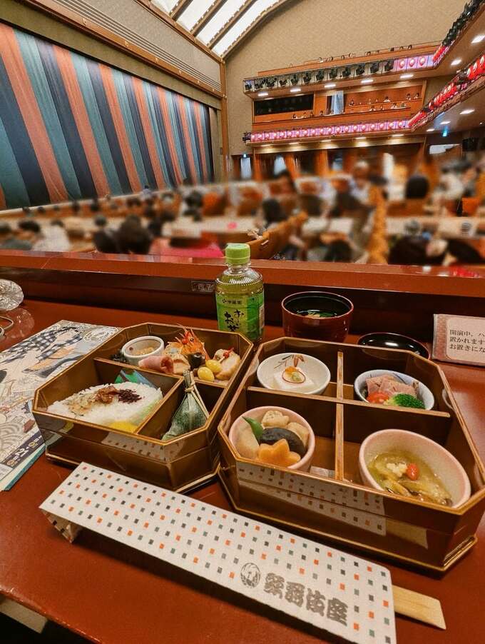 桟敷席では幕の内弁当と緑茶を楽しむ様子も投稿されており、黒、柿色、萌葱の歌舞伎の定式幕が見える特別な雰囲気の中での観劇を満喫した様子がうかがえます。