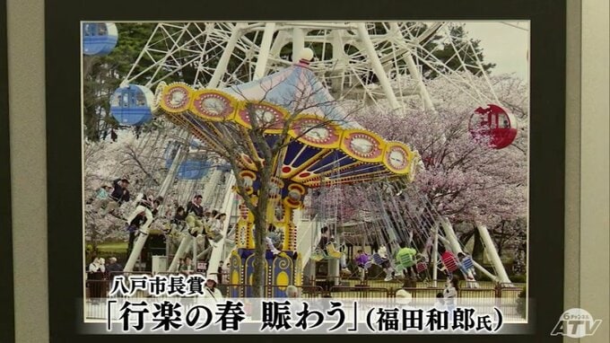 一般部門最高賞にあたる八戸市長賞に輝いたのは、福田和郎さんの作品「行楽の春賑わう」です。満開のサクラを背に家族連れなどが大型遊具で遊ぶ春の一コマを切り取っています。