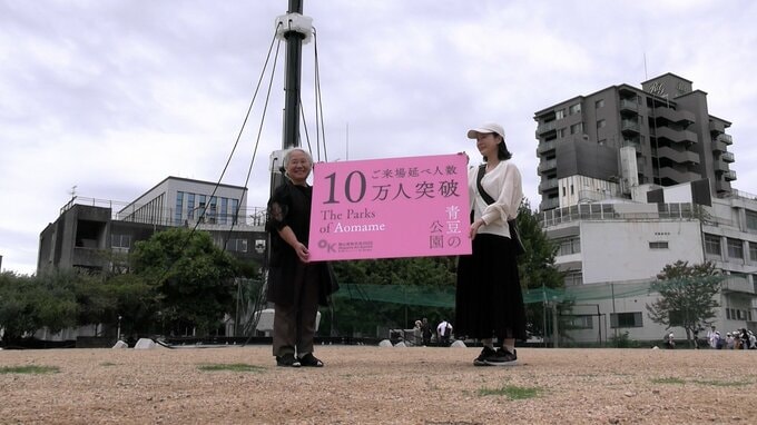 先月(9月)26日から開かれている「岡山芸術交流」、10万人目の来場者となったのは倉敷市から訪れた桒田雅子さんです。メイン会場になっている旧内山下小学校で記念セレモニーが開かれ、実行委員会事務局から公式グッズが贈られました。