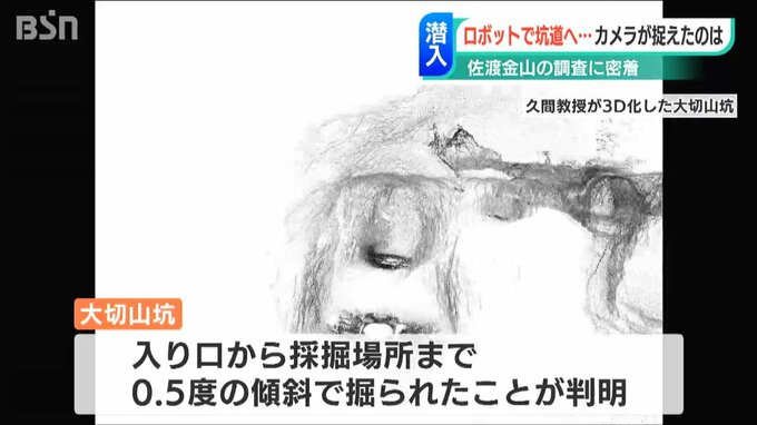 佐渡金山の大切山坑には何度も調査に入り、坑道を3D化するなど解析を進めてきました。その結果、入口から採掘場所に向かって傾斜がおよそ0.5度あることが分かったといいます。