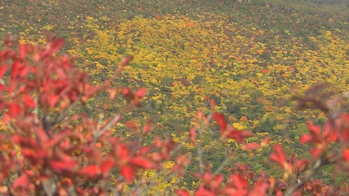 赤や黄色、緑。様々な色に染まった紅葉が、山々を彩ります。今年は、残暑の影響で例年より1週間ほど遅い10月上旬から色づき始め、山頂付近はいま、見頃を迎えています。
