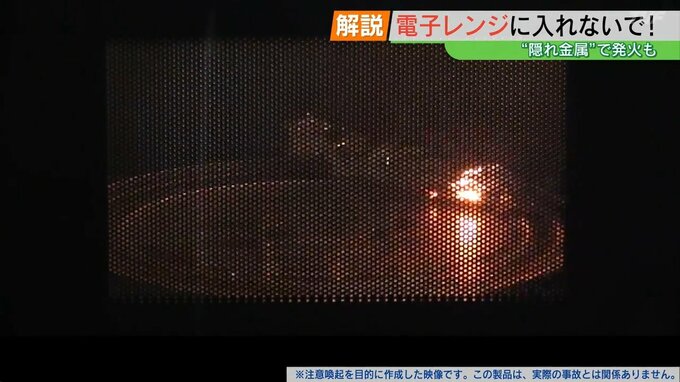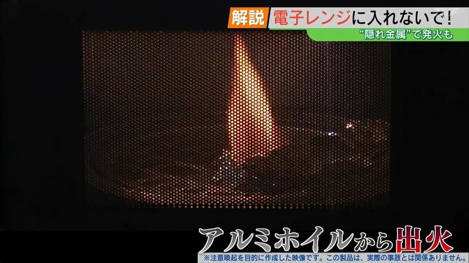 そして、しばらくすると、アルミホイルが燃え出しました。「レンジモード」で加熱すると、電磁波によってアルミ箔はスパークしてしまいます。そのため、アルミホイルを使う場合は、電磁波を使わない「オーブン・グリルモード」で調理しなければなりません。