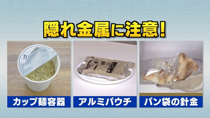 また、気を付けてほしいのが「隠れ金属」の存在です。一見金属を使っていなさそうに見えても、例えば、カップ麺の容器は、蓋が金属になっていることがあります。他にもレトルト食品のアルミパウチや個包装のお菓子の袋、そして針金なども「隠れ金属」なので、電子レンジで加熱しないようにしてください。