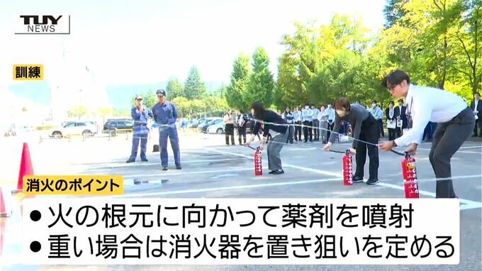 きょうは消防署員も訓練に立ち合い、職員が普段使うことの無い、消火器や消火ホースの使い方を学びました。