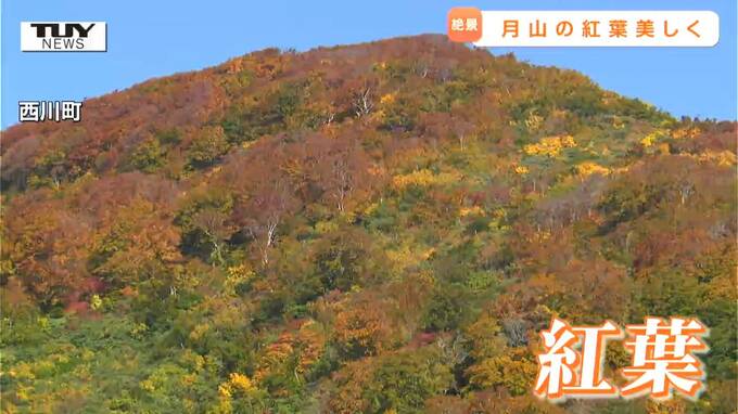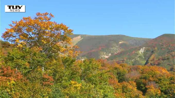 青空の下に広がる赤や黄色や緑のグラデーション。木々が色鮮やかに染まっています。県のほぼ中央に位置する月山では今、紅葉が見ごろを迎えています。