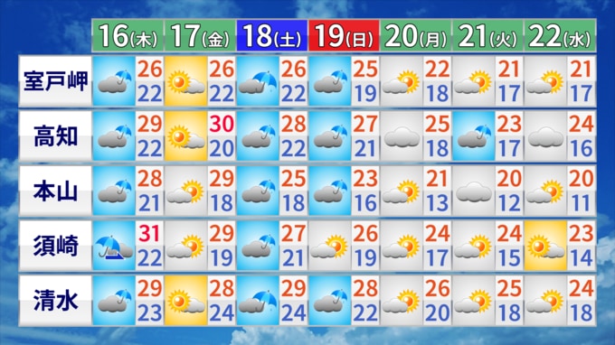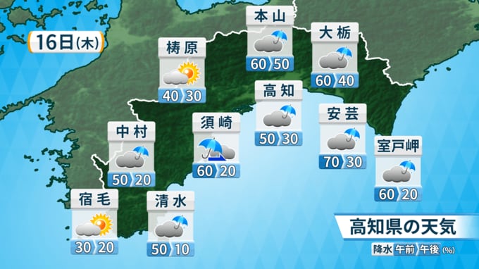 16日の高知県内は、前線や湿った空気の影響で曇り、明け方まで雨となるでしょう。雷を伴い、東部では明け方まで非常に激しい雨の降る所がある見込みです。日中は、雨の止むところが多いですが、雲が広がりやすく日差しが届く時間が少なくなりそうです。