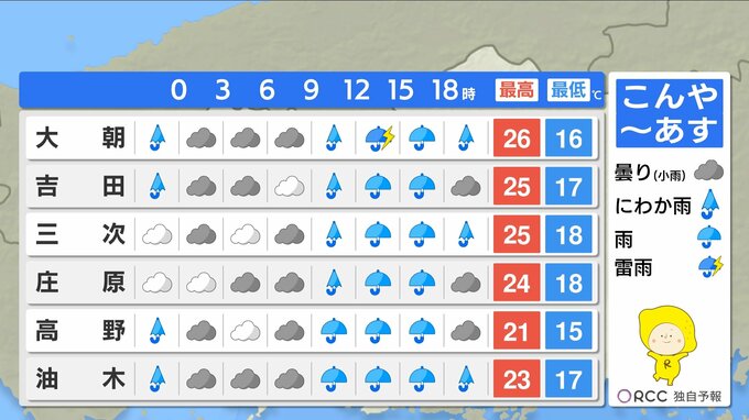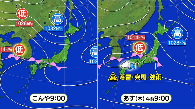 この後前線上に新たに低気圧が発生し、日本海を東進する予想です。低気圧からのびる秋雨前線が県内を南下する見込みです。前線や低気圧に向かって暖かく湿った空気が流れ込みやすくなり、大気の状態が非常に不安定になります。断続的に雨が降り、こんやからあすの午前中にかけて雨が降ったりやんだりでしょう。あすは朝から傘が手放せない一日になりそうです。午後は発達した雷雲が県内を南下し、局地的に雷を伴い激しく降る地点がある見込みです。