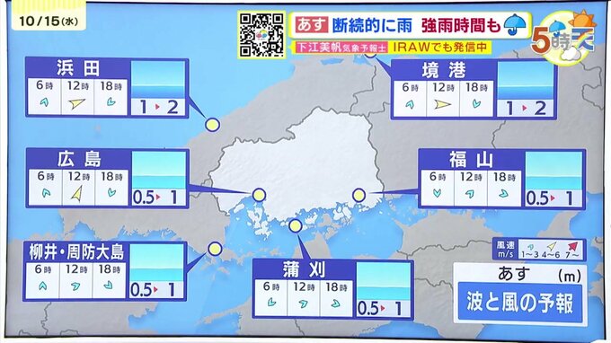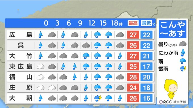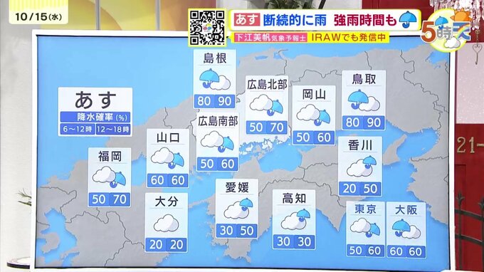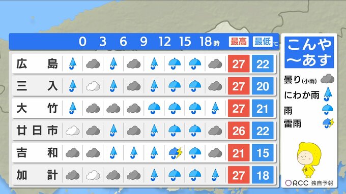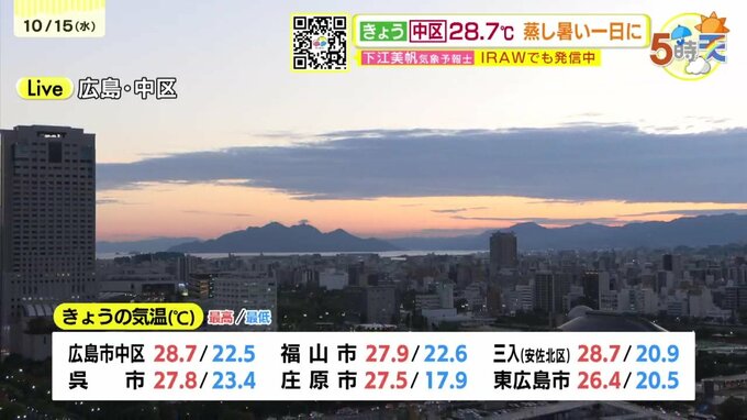 きょう15日(水)の広島県内は、夜中は雨が降った地点が多いですが、午前中から晴れ間が出ました。最高気温は、広島市中区や三入で28.7℃などきょうも厳しい残暑が続いています。前線の影響で蒸し暑い一日になりました。