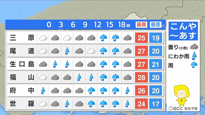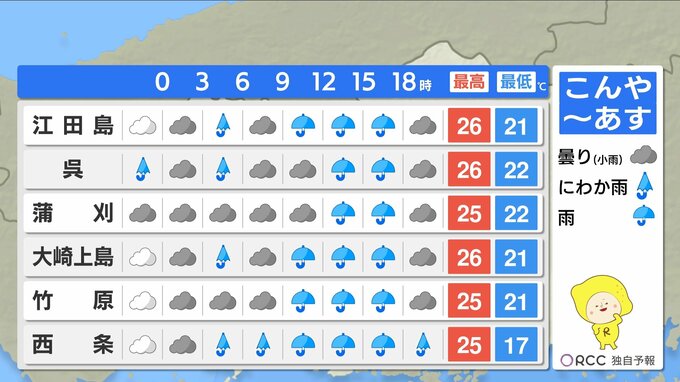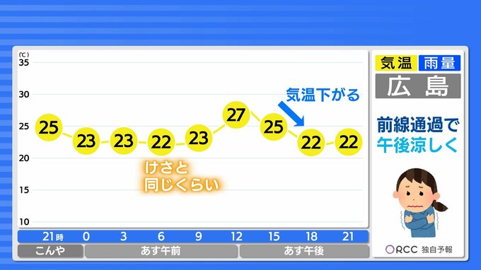 あすは前線が県内を南下した後、午後は気温が下がる見込みです。最高気温は25℃~27℃くらいの地点が多い見込みですが、体感はもう少し涼しく、肌寒く感じるかもしれません。重ね着のしやすい服装でお過ごしください。