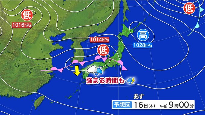 16日(木)断続的に雨 局地的に雷を伴い激しく降る時間帯も 日中は前線通過で涼しく