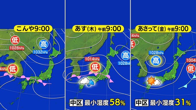 あさって金曜日は晴れる予想で、空気はカラッとし過ごしやすくなりそうです。週末は低気圧や前線が通過するため雨が降るでしょう。土日の雨が季節を進める雨になり、来週になると大きく気温が下がり、この時期らしい気温になる見込みです。この週末の内に衣替えを進めておいた方が良いでしょう。