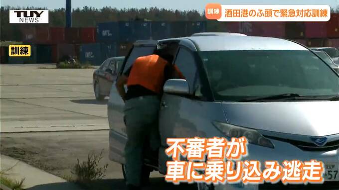 またこちらは、外航旅客船に乗ってきた不審者がゲートから侵入してきた車に乗り込み逃走したとの想定で行われた訓練です。不審車両を警察車両が追跡し制圧します。