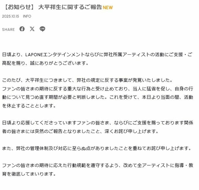 公式サイトでは「大平祥生につきまして、弊社の規定に反する事案が発覚いたしました。」と報告。「当人に猛省を促し、自身の行動について見つめ直す期間が必要と判断」「本日より当面の間、活動を休止することとします」と説明しています。