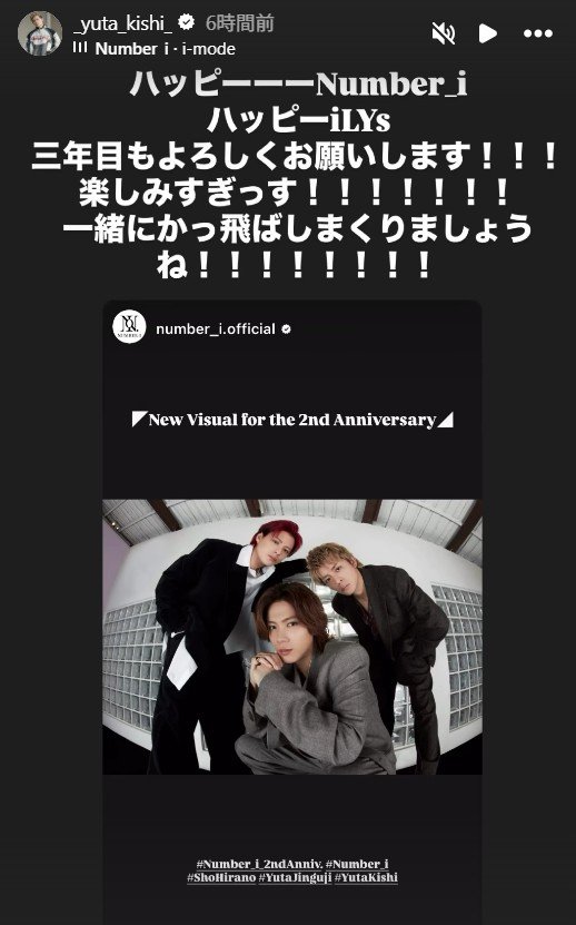 岸優太さんは「ハッピーーーNumber_i ハッピーiLYS 三年目もよろしくお願いします!!!」と、投稿。