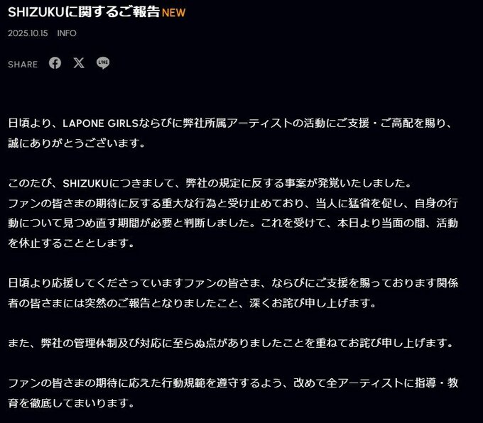 公式サイトでは「SHIZUKUにつきまして、弊社の規定に反する事案が発覚いたしました。」と報告。「当人に猛省を促し、自身の行動について見つめ直す期間が必要と判断」「本日より当面の間、活動を休止することとします」と説明しています。