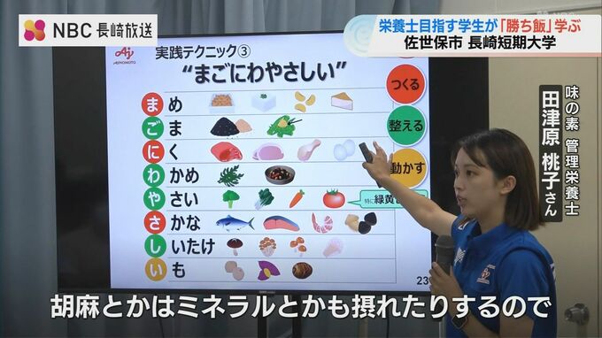 将来、栄養士を目指す長崎短期大学の学生およそ40人が、日本代表のアスリートにも食事を指導する味の素の管理栄養士から、試合前などにエネルギーを補う補食の大切さやバランスのよい献立づくりのコツなどを教わりました。