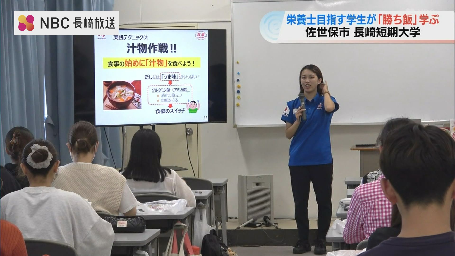 将来、栄養士を目指す長崎短期大学の学生およそ40人が、日本代表のアスリートにも食事を指導する味の素の管理栄養士から、試合前などにエネルギーを補う補食の大切さやバランスのよい献立づくりのコツなどを教わりました。