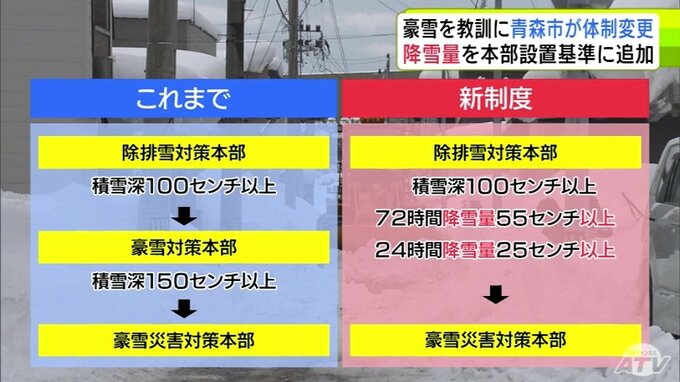 青森市は昨シーズン、多くの苦情が寄せられた除排雪体制の見直しを発表しました。短時間にまとまった雪が降った時に対応するため、降雪量を対策本部の設置の基準に加えました。