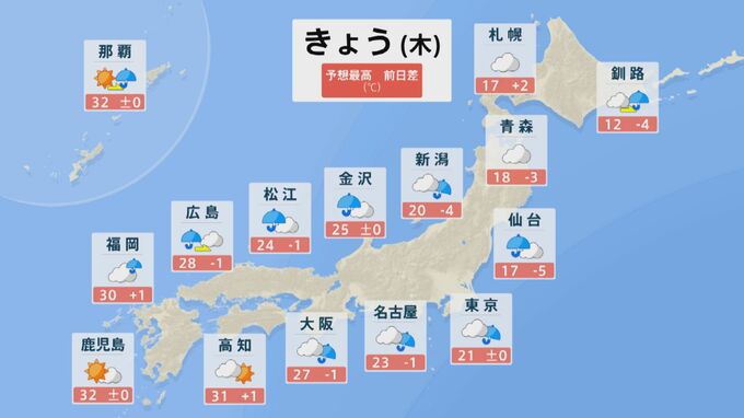 16日は、九州北部から東北にかけて雨の降る天気になるでしょう。北海道でも雲が広がり雨の降るところがありそうです。
