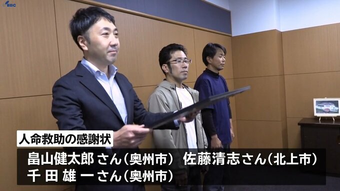 釜石警察署の松本一夫署長から感謝状を贈られたのは、奥州市の畠山健太郎さん、北上市の佐藤清さん、奥州市の千田雄一さんの3人です。