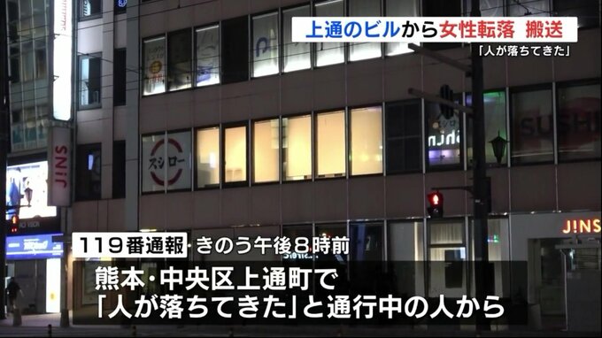 警察と消防によりますと15日午後8時前、熊本市中央区上通町で「人が落ちてきた」と通行中の人から119番通報がありました。