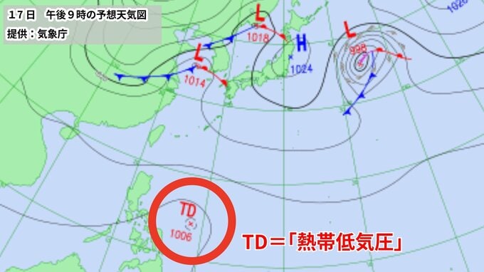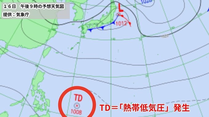 気象庁が発表するきょう(16日)午後9時の予想天気図によりますと、フィリピンの東に『台風のたまご』となる『熱帯低気圧』が発生するということです。