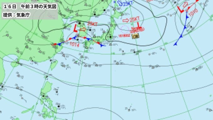 16日午前3時現在の天気図【画像②】では、気圧は低くなっていますが、まだ低圧部(熱帯じょう乱)はできていません。