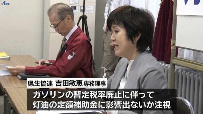 県生協連の吉田敏恵専務理事は、ガソリンの暫定税率廃止に伴ってガソリンの定額補助金がなくなった場合に、灯油の定額補助金に影響が出ないか注視しています。