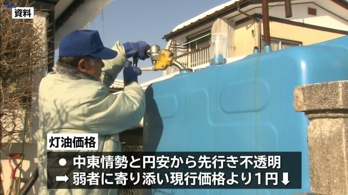 中東情勢に未だ不安定要素が残り円安傾向も続く見通しから、灯油価格の先行きは不透明としながらも高齢者や教育現場などに配慮して現行価格より1円下げました。