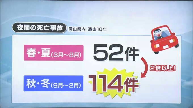 岡山県警のまとめでは、日没が早まる秋から冬にかけての時期は、春から夏に比べて、夜間の死亡事故が2倍以上になったというデータもあります。夜の時間が長くなるこれからの時期、それぞれにできる安全対策を今一度見直す必要がありそうです。