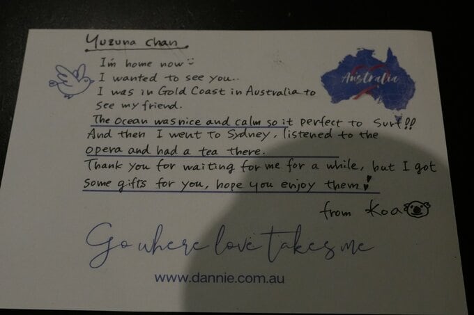 英語で書かれたポストカードもあった。なんと急にいなくなった「コアちゃん」からゆずちゃんにあてた英語の“手紙”だった。