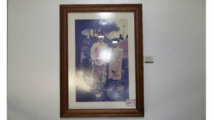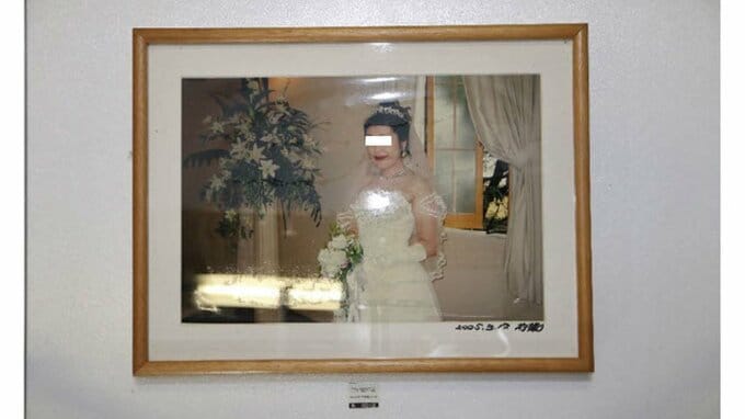 額に入った写真は、ウエディングドレスを着てブーケを持つ女性が窓際で微笑んでいる。写真には「2005.3.17 前撮り」と記されている。