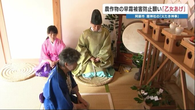 「乙女あげ」と呼ばれる今日(16日)の神事では、今年「火たき乙女」を務めた阿蘇小学校4年生の森 保乃華さん(9)が、祖母とともにご神体を温め続けた火を鎮めました。