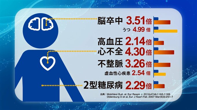 「睡眠時無呼吸症候群だから必ず病気になるというわけではありません。ただし、治療を受けていない場合、脳卒中や心不全など、さまざまな疾患のリスクが高まることが分かっています」